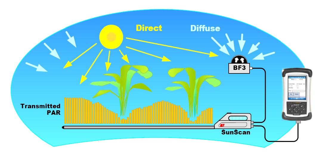 SunScan冠層分析系統(tǒng)通過測量作物冠層PAR值提供了關(guān) 于影響田間作物生長的限制因素的有價值的信息,如葉面積指數(shù)(LAI)。SunScan探測器也可被用來描繪作物冠層PAR的分布圖。